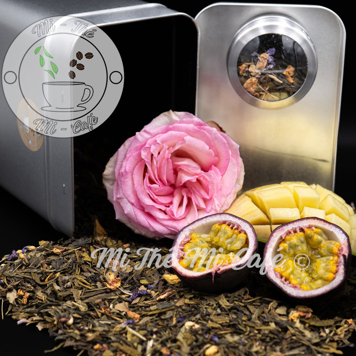 Ce thé blanc au fruits des îles et jasmin est une explosion de saveurs et de couleurs, une invitation à se promener dans un jardin exotique. Fruits exotiques, citrus et jasmin.