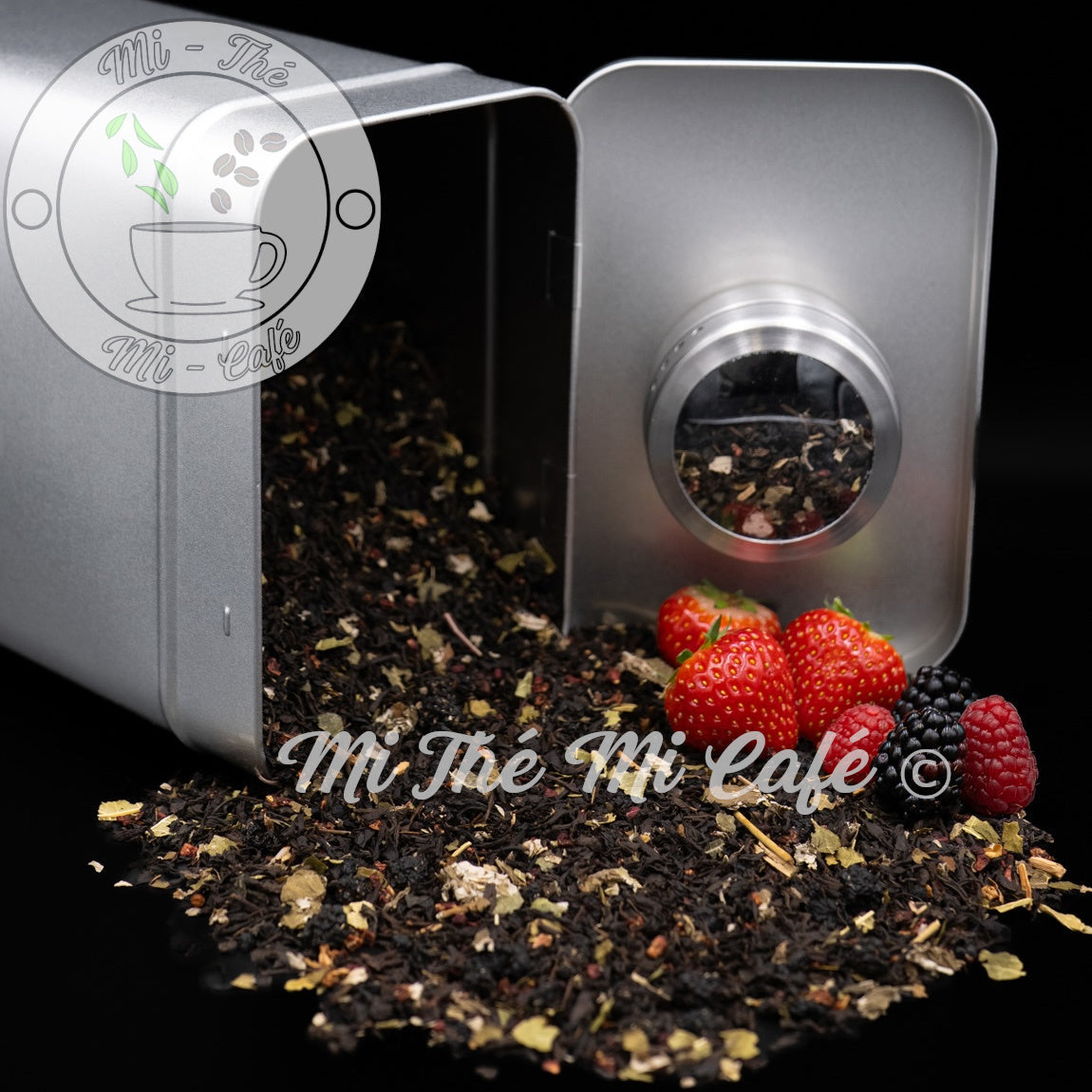 Thé parfumé savoureux avec morceaux de fruits, de fraises des bois, cassis et mûres.