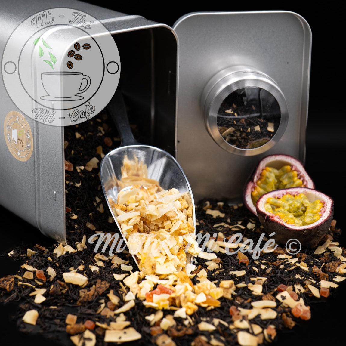 Destination exotique avec ce thé aromatisé à la coco, à l'ananas, et aux fruits de la passion. Aussi beau visuellement que bon à la tasse. Dépaysement garanti