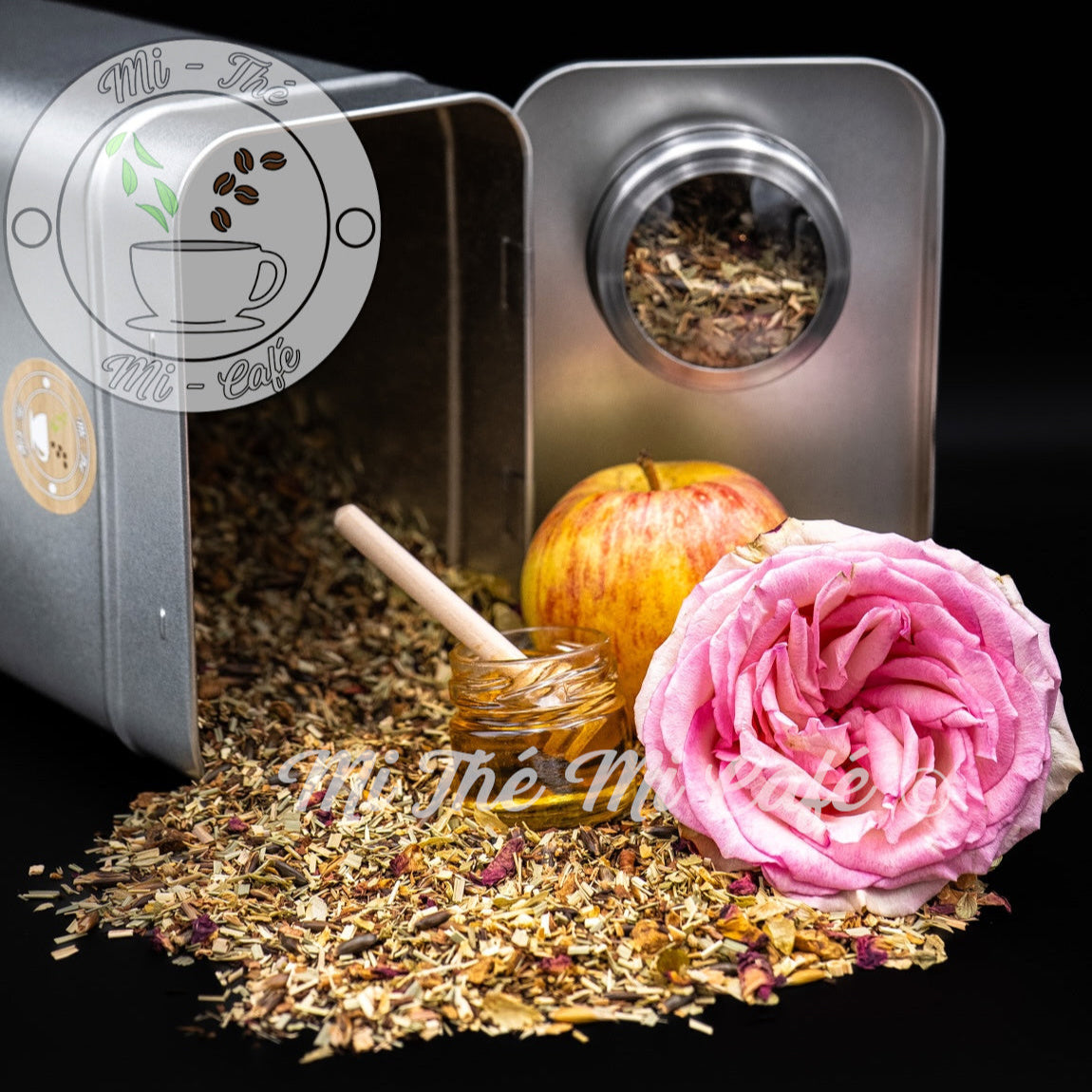 Tilleul, avoine, orange, pomme, pétales de roses, fleurs de houblon, miel et honeybush