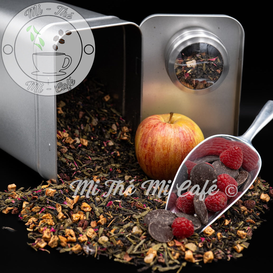 Des framboises entières sur un blend de thé vert et de thé noir au chocolat.