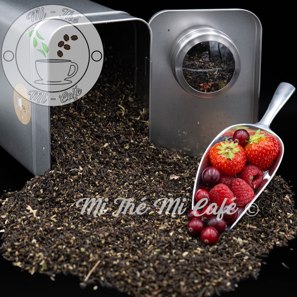 Des morceaux de mûres et de fraises qui s'entremêlent sur une base de thé noir.