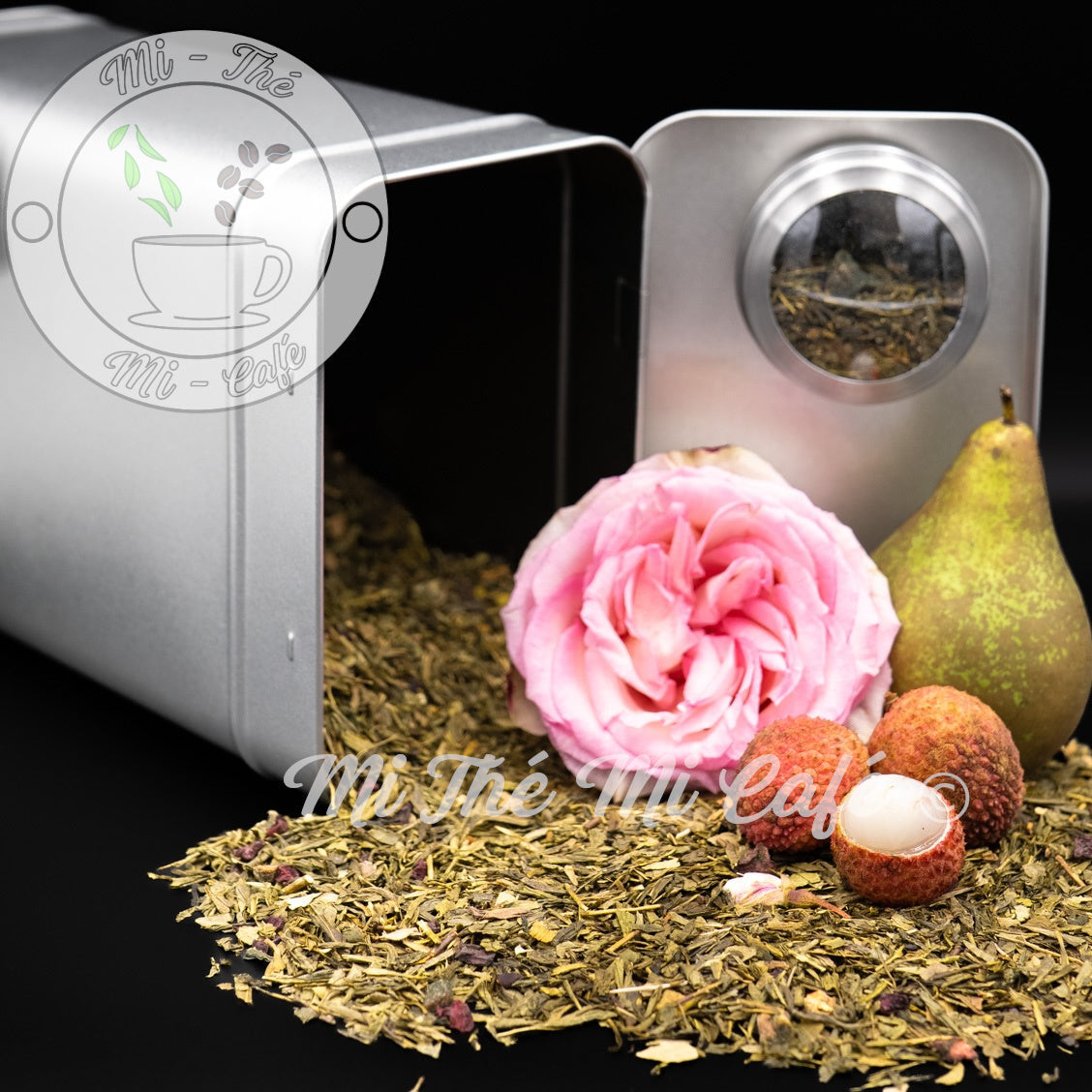Thé vert fin et élégant parsemé de boutons de rose entiers. La poire se marie à